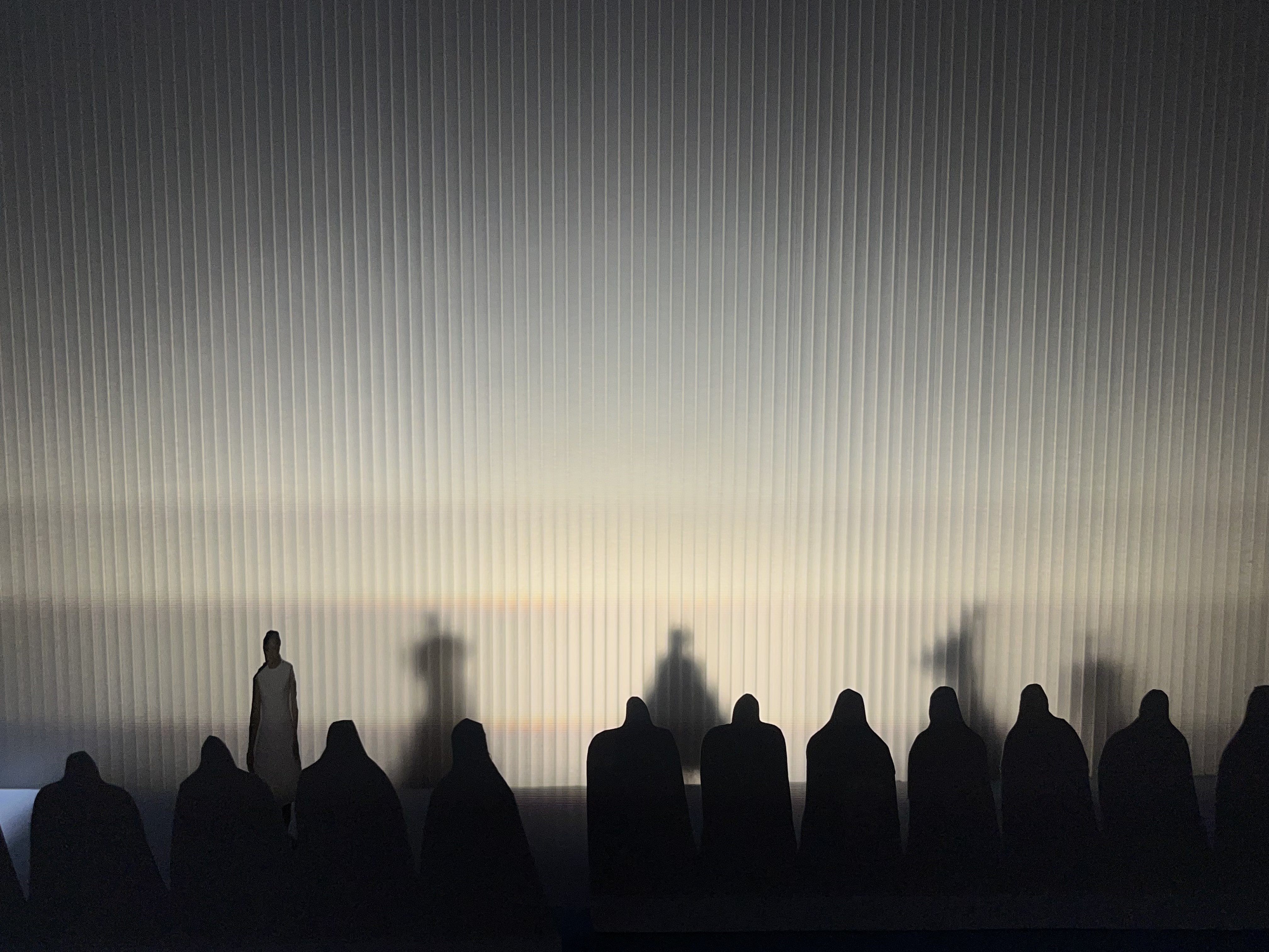On the perimeter, a scenographic white curtain completely obscures the showspace from natural light. Moments before the show begins, a carefully orchestrated play of lights unveils a captivating spectacle of shadows and silhouettes, exposing the dynamic flurry of activity and meticulous preparations unfolding behind the scenes. This artful presentation grants the audience a glimpse into the enigmatic realm on the other side. The translucent wall, composed of modular polycarbonate panels spanning over 80 metres, functions both as a filter, concealing the invisible mechanics behind the scenes, and as a canvas, showcasing the collections of the students.