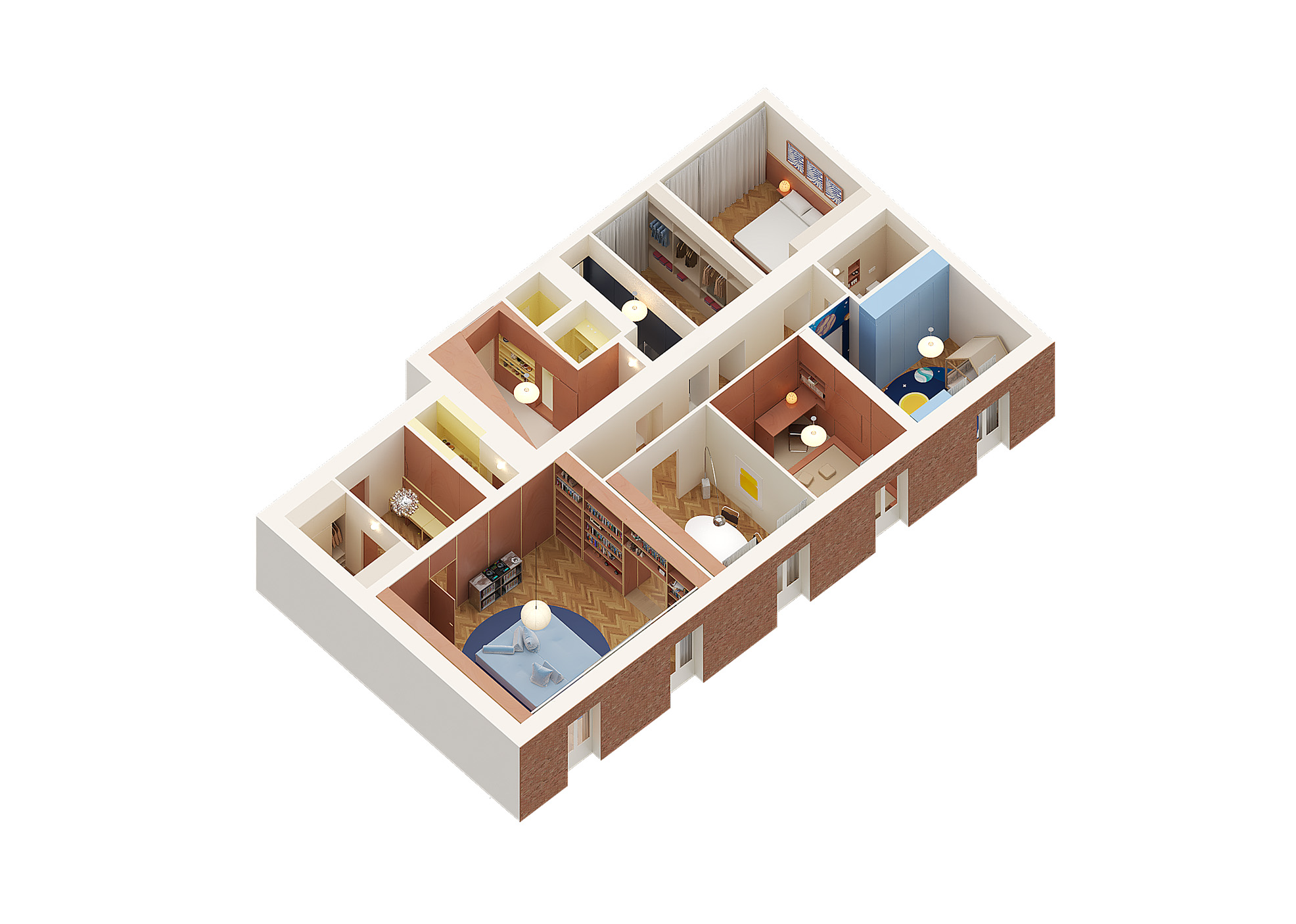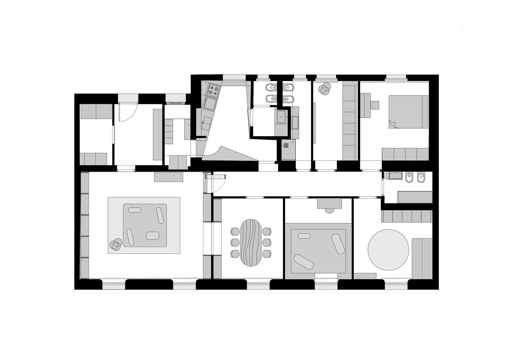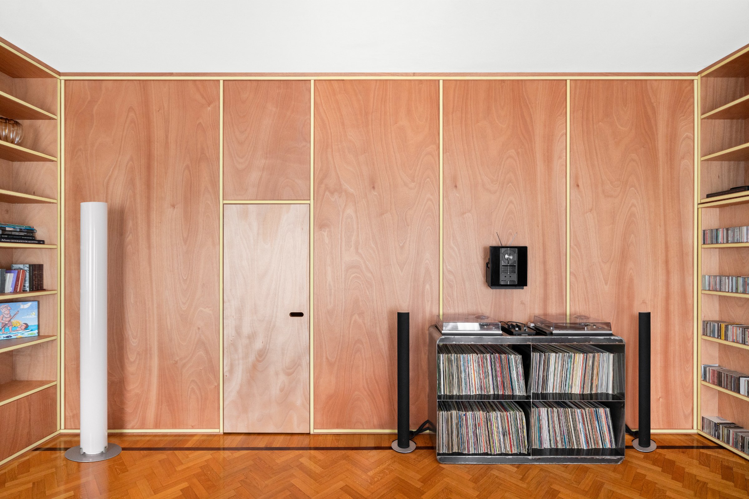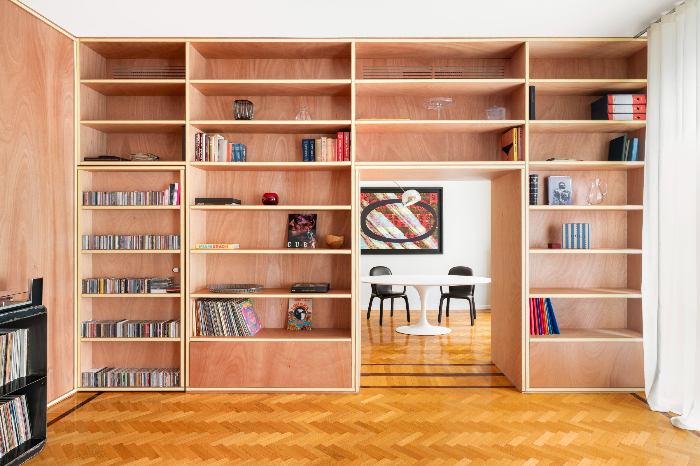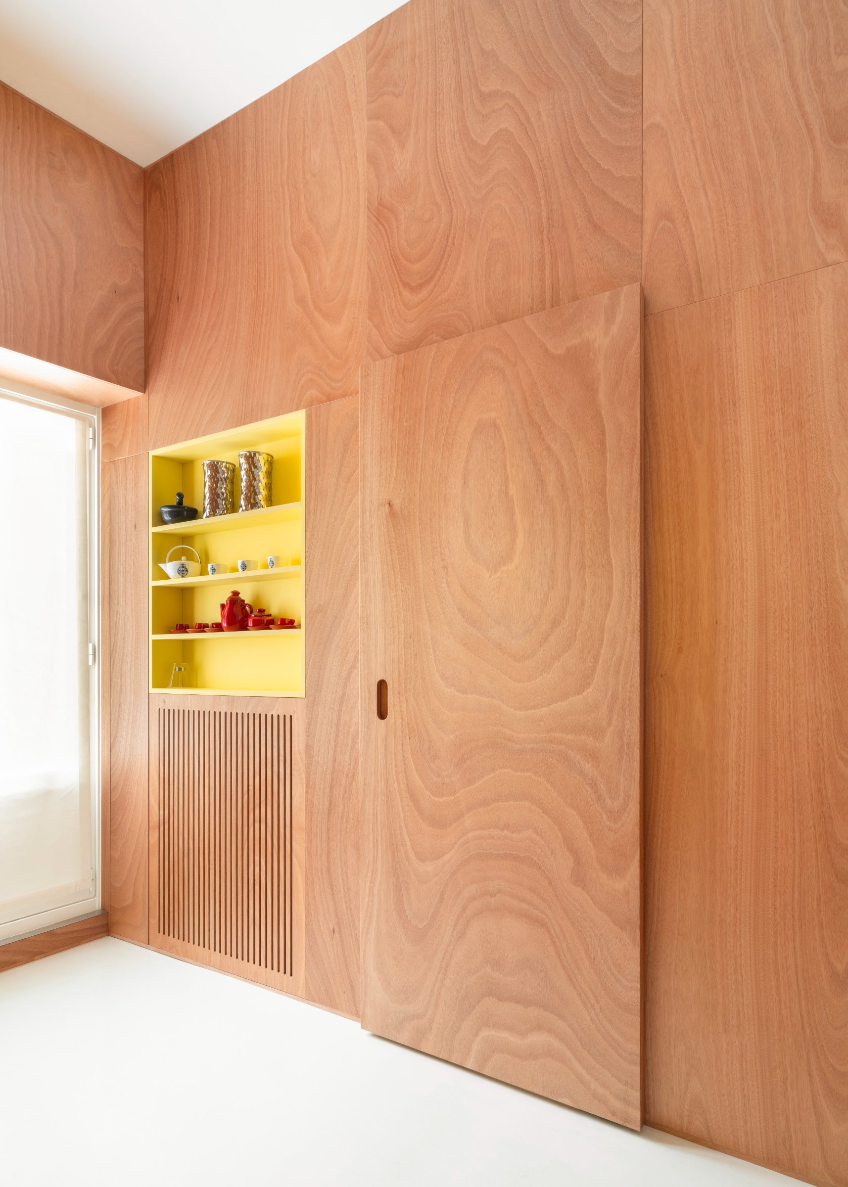 Doors are absorbed into furniture and boiserie, allowing circulation to slip between rooms.