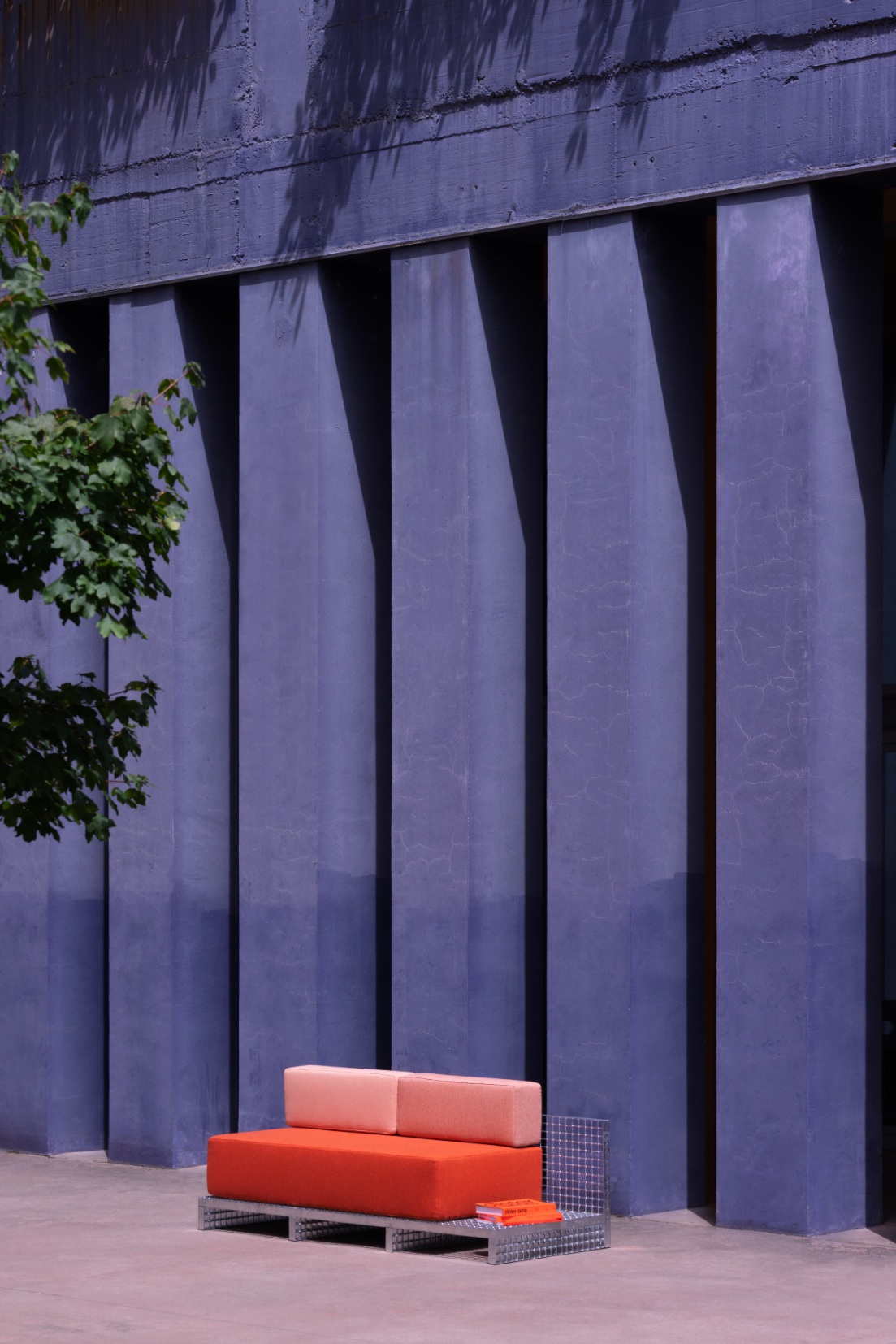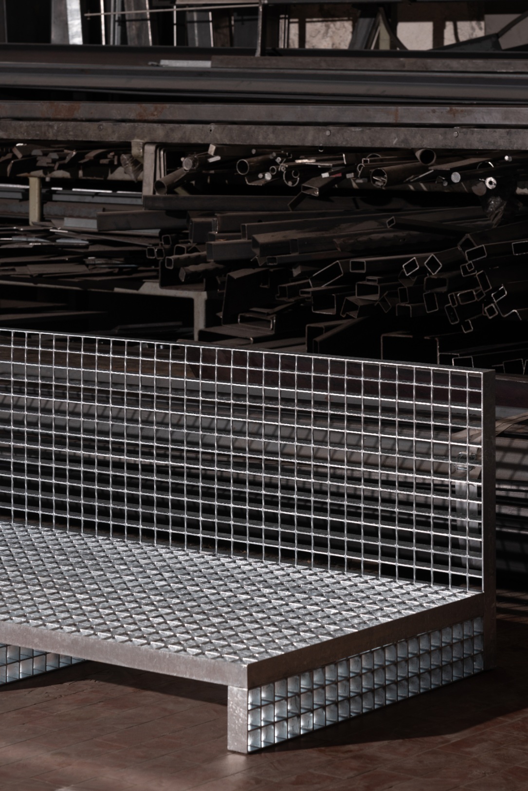 Industrial steel grating, post-consumer recycled wool upholstery.