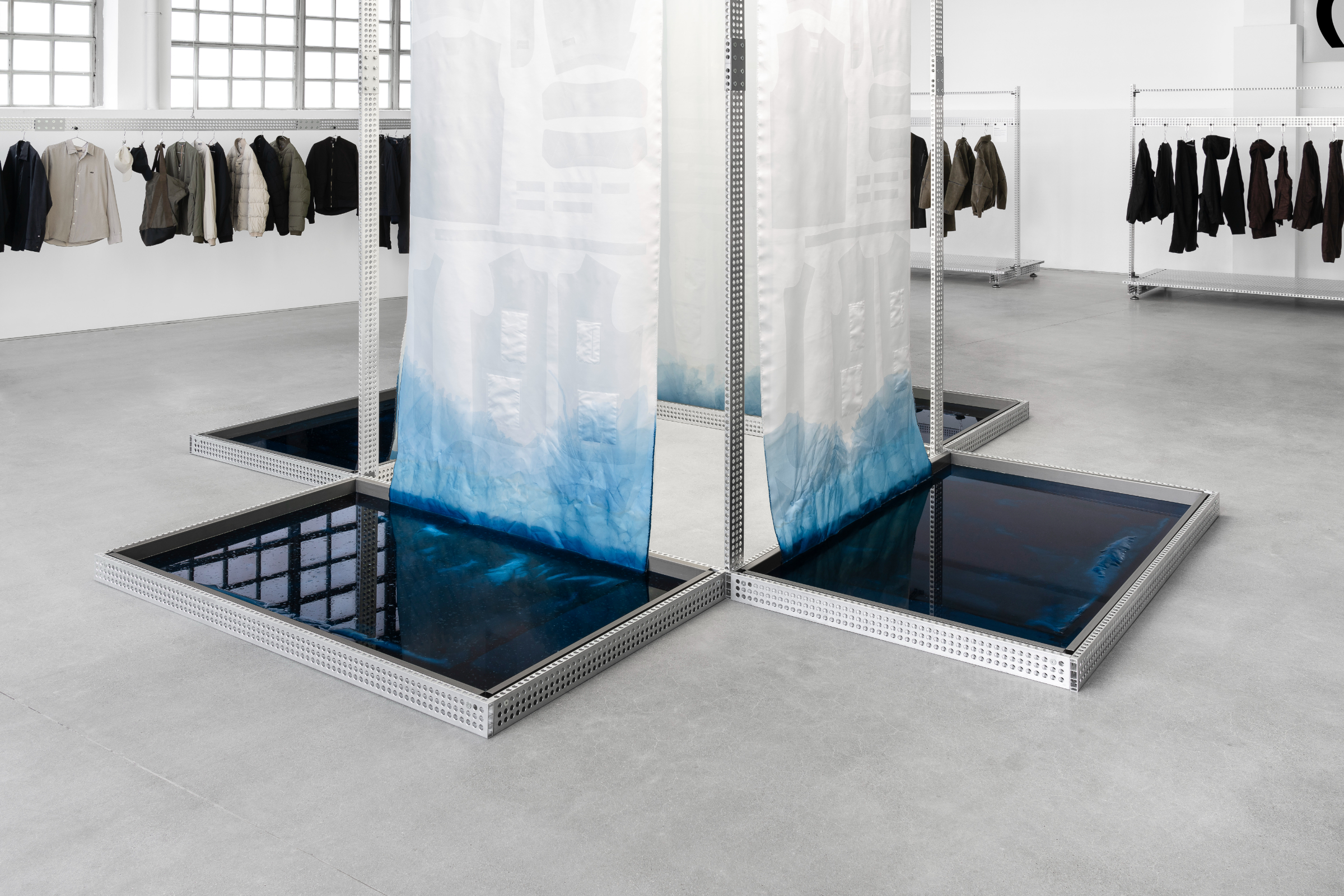 The central installation acted as a three-dimensional frame for 6-meter-long textile samples. Suspended above four steel basins filled with blue-tinted water, the fabrics slowly absorbed the dye, shifting in hue throughout the opening month.