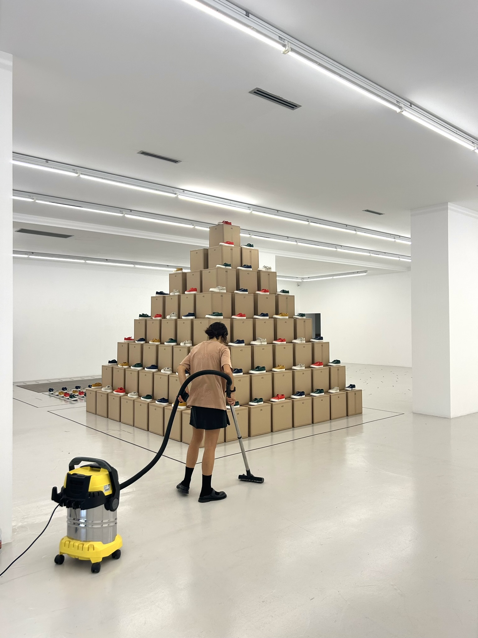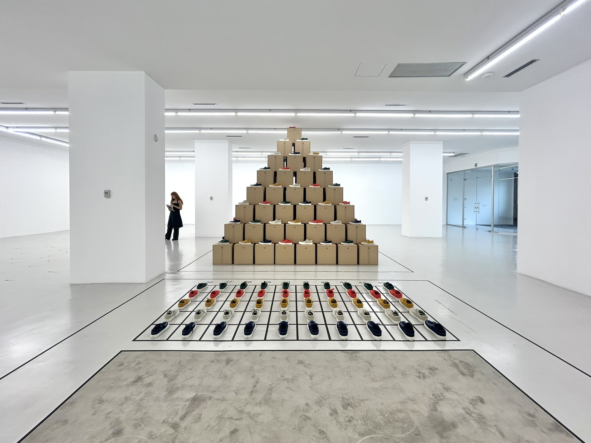Hosted by Milan contemporary art gallery Cassina Projects, the Milan Fashion Week installation featured a large pyramid made of recycled cardboard boxes, with Sunnei x Camper’s ForOne sneaker collection interspersed across levels. The footwear is 100 per cent symmetrical, meaning each shoe can be worn on the left or right foot, a unique quality that Ab(Normal)’s installation highlights through clear geometries. In red, white, yellow, green and blue, the sneakers provided a colourful contrast to the otherwise-empty all-white room and beige pyramid. A two-day event utilized this scene as a backdrop, inviting visitors to take part in a game-cum-experiment. Dots punctuating the ground were labelled with ‘No Left’ and ‘No Right’, prompting people to create their own choreographed path through the space and ultimately try the shoes on. Grid drawings referencing Hopscotch served as outlines on the floor.